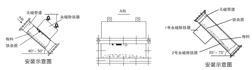 | 型號(hào) | 適應(yīng)產(chǎn)量≤T/h | 管道外形尺寸 L×W×Hmm | 永磁鐵外形尺寸 L×W×Hmm | 法蘭接口外形尺寸W×Hmm | 適應(yīng)坡度與地面夾角 | 物料適應(yīng) |